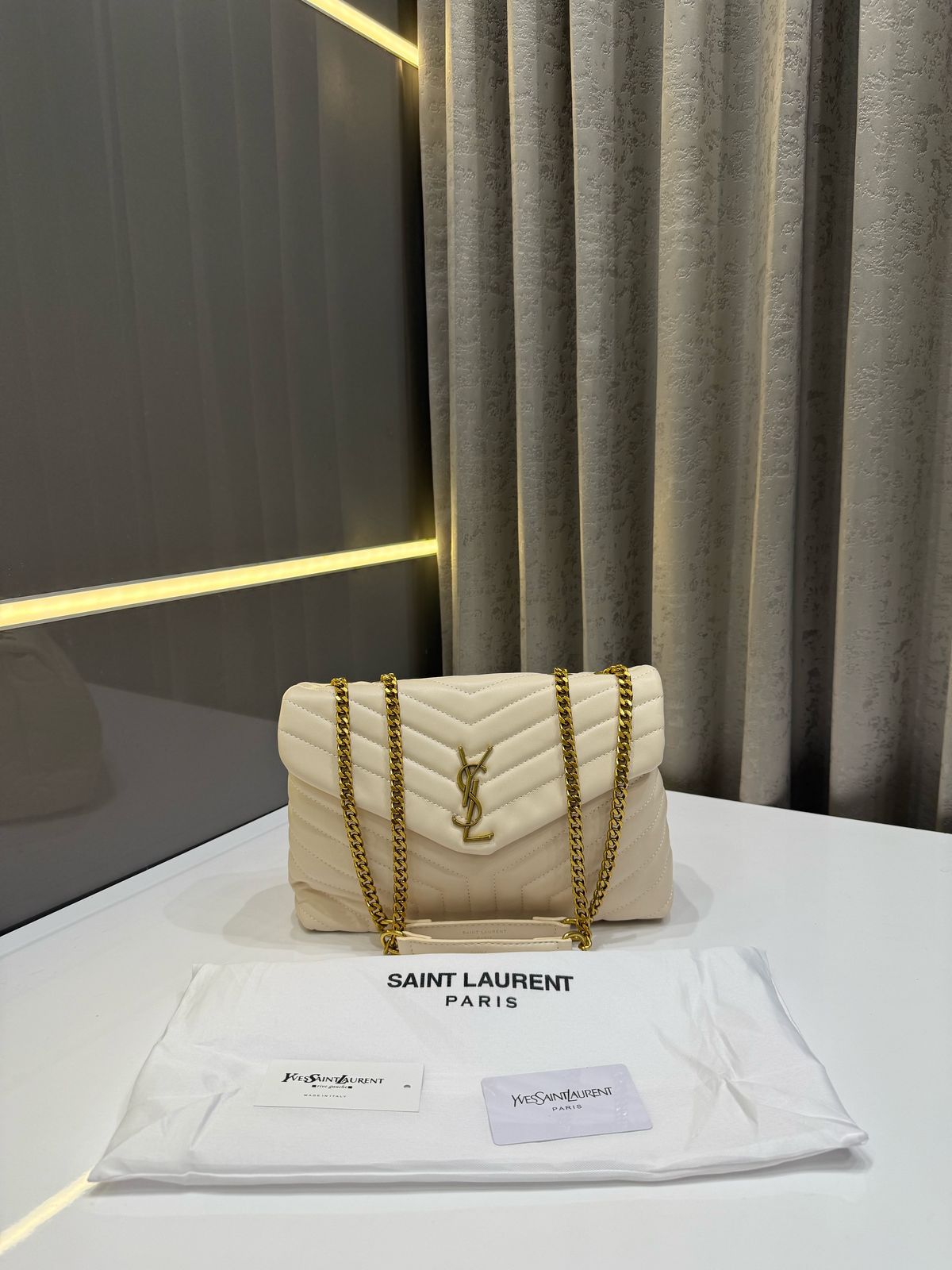 A luxurious designer bag showcasing Saint Laurent’s signature elegance, crafted from premium materials and accompanied by the original dust bag for authenticity and protection.